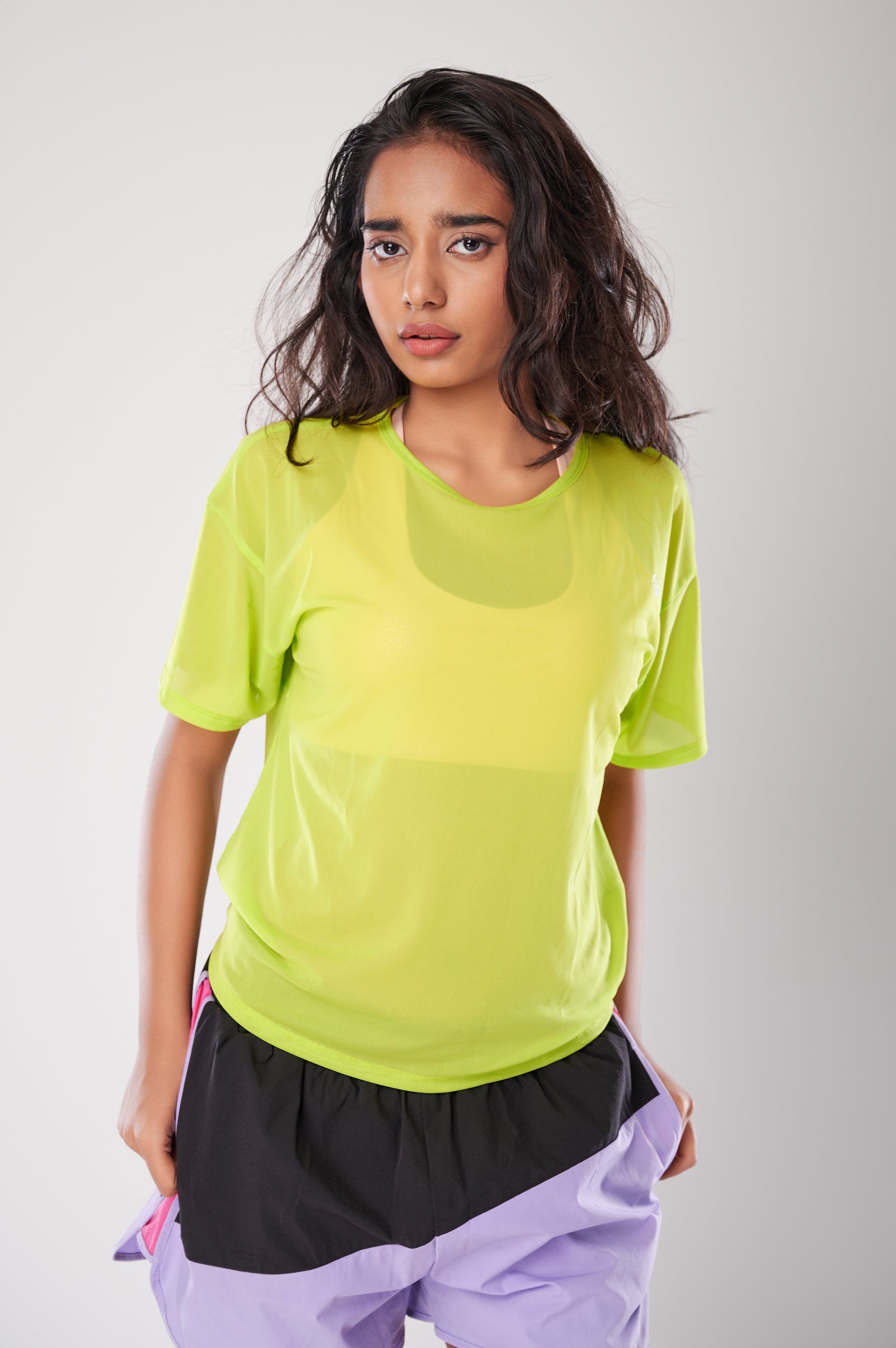 Our high-performance Neon Tie-Up Mesh Tee allows you to stretch or run with ease. The quick-dry fabric absorbs moisture keeping you as fresh as when you started. Pair it with a Sports Bra for some extra sass! The back tie-up adds an element of flair to your training outfit.